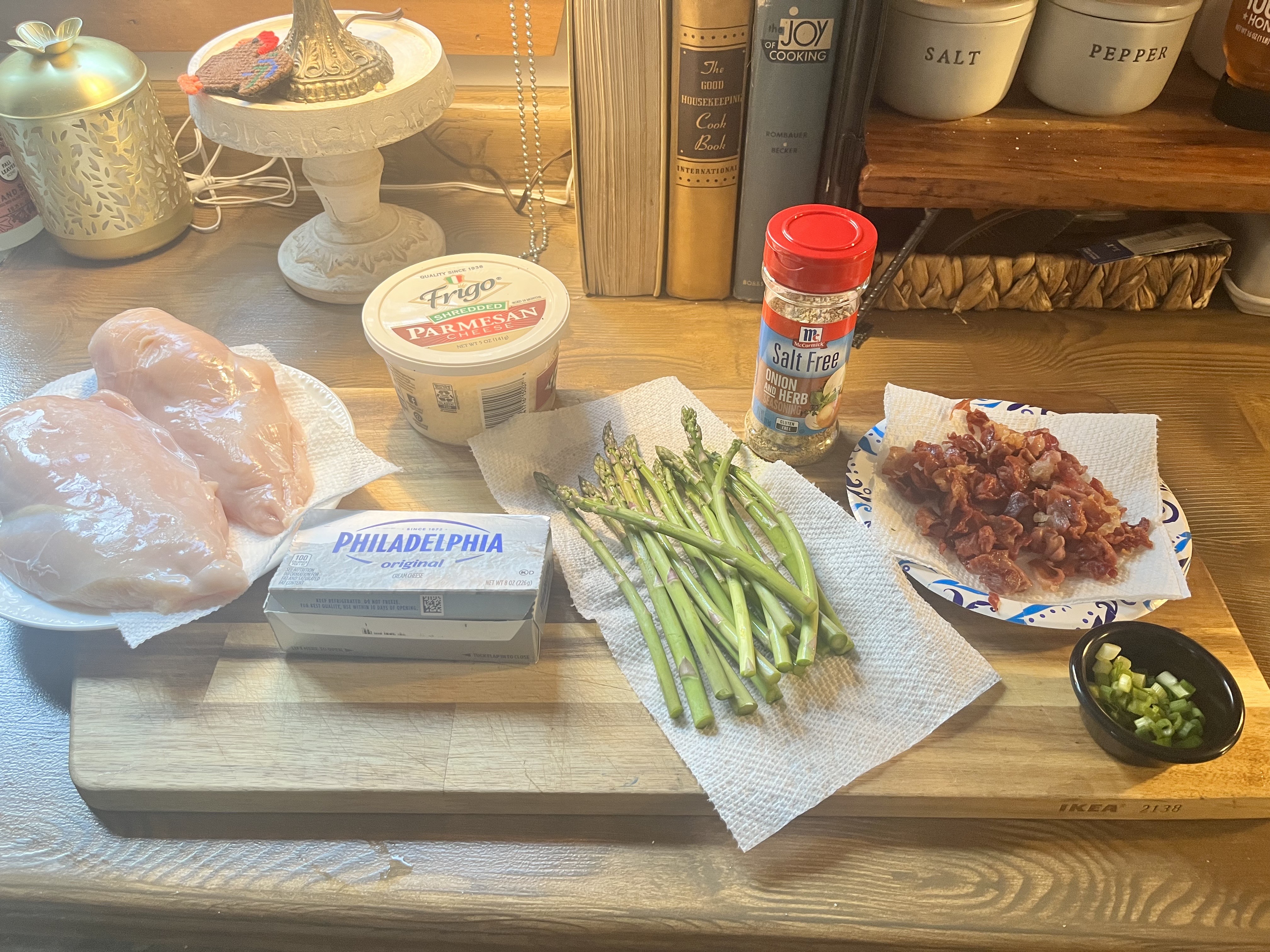 Place chicken on a baking sheet lined with foil and sprayed with a little olive oil. Spread thee divided mixture on the right side of each chicken breast, spreading evenly. Next place 5-6 asparagus spears over the mixture and pull the left side over the right securing with a toothpick if needed.